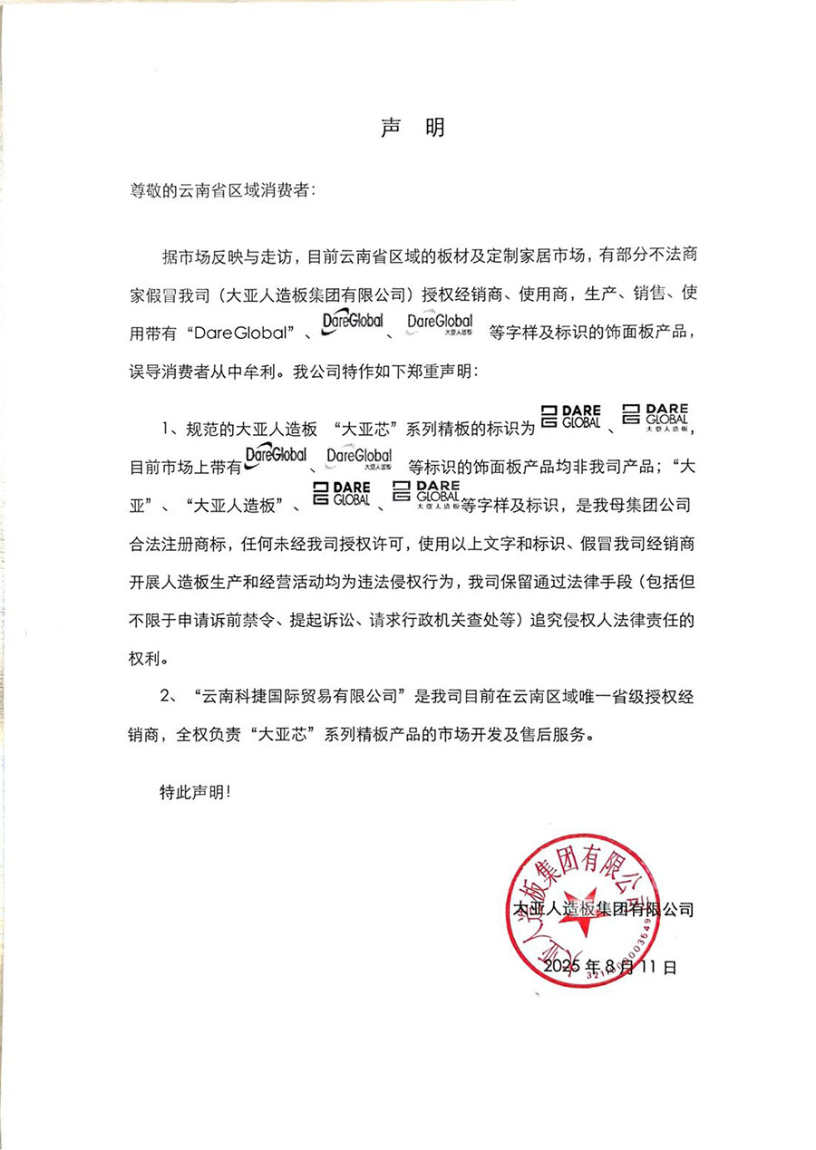 據(jù)市場反映與走訪,目前云南省區(qū)域的板材及定制家居市場,有部分不法商家假冒我司(大亞人造板集團(tuán)有限公司)授權(quán)經(jīng)銷商、使用商,生產(chǎn)、銷售、使用帶有“DareGlobal”、、